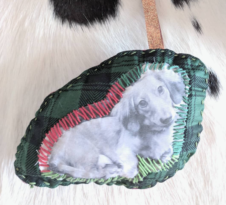 - Sew the pet photo to the fabric. With the embroidery floss color/s of your choosing, sew the pet fabric to the front piece. You will see how the white border around the pet photo comes into play here now.