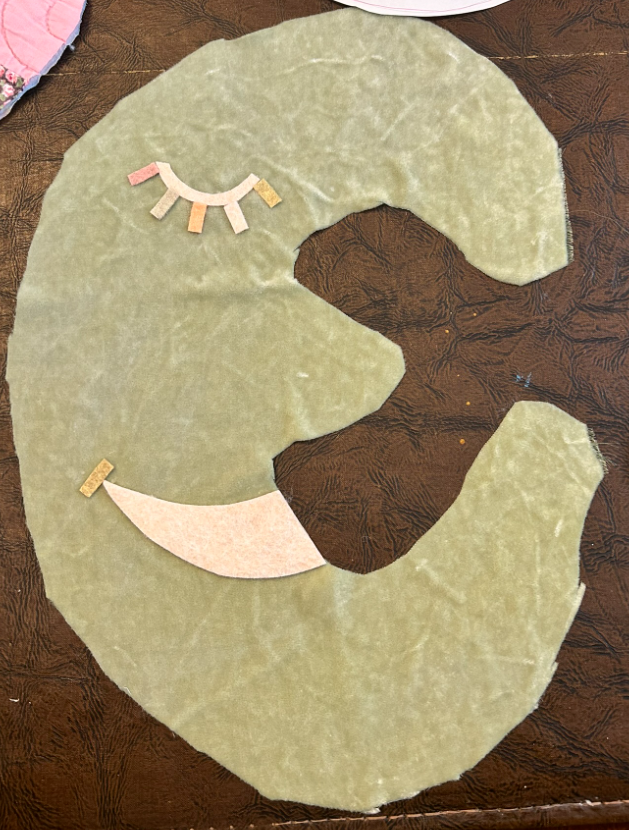 - Cut out your fabric. At this point, you will need to choose a fabric for both the front and the back of the plushy. For the moon, I decided to use velvet for the front and my great grandmother's quilt for the back. For the penguin, I used the quilt for both the front and the back. Pin the pattern to your fabric right side up and cut out the form. Next, flip the pattern over, pin it to the back side fabric, and cut it out. The front and back pieces should mirror each other.
