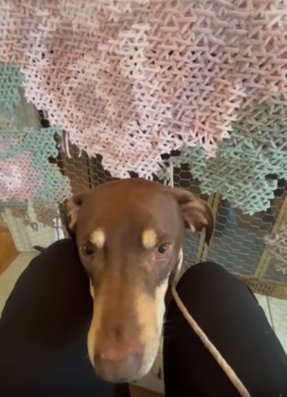 - Continue stitching as instructed in the previous step, and make progress day by day. This is not something you will finish all in one day unless you are an expert stitcher. It definitely does take some practice getting the hang of things with the rows and the type of stitch you need to make. You can go row by row if you would like. However, I tried to do as much of one chunk of color as I could where it was touching before switching to another. When beginning a color chunk, I would tie off the yarn in a corner of a hexagon, stitch until I was finished with the color, and tie the other end to the ending hexagon. Pedro, one of my dogs ๐ถ, was a very helpful companion during this process .