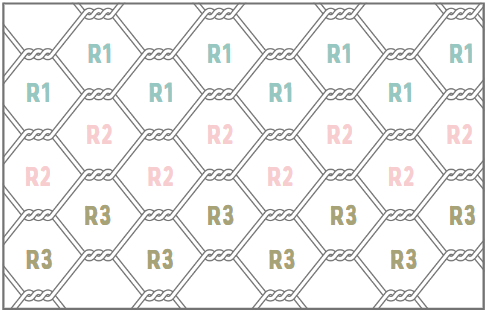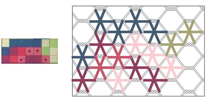 - Start stitching your pattern. This project is not as straightforward as a regular cross stitch and is relatively tricky to get started. Since chicken wire is a hexagonal shape, there are a couple of nuances that you need to be aware of before starting your stitch work. First, the rows are not exactly straight like in the pattern, so you need to be really mindful of which hexagon goes with which row. The rows zigzag back and forth as pictured below. Second, the hexagon shape does not allow for the traditional cross stitch like with a square. Instead, you need to make a star pattern. It might look a little weird at first, but trust the process.